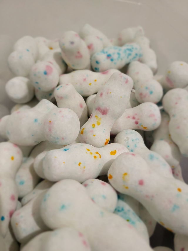 Dextrose, sucre, gomme base, sirop de glucose, acidifiant: acide citrique; arômes, humectant: glycérine; amidon modifié, colorants: E133, E141, E160a; concentré de carotte noir, agent d’enrobage: E904; antioxydant E321.